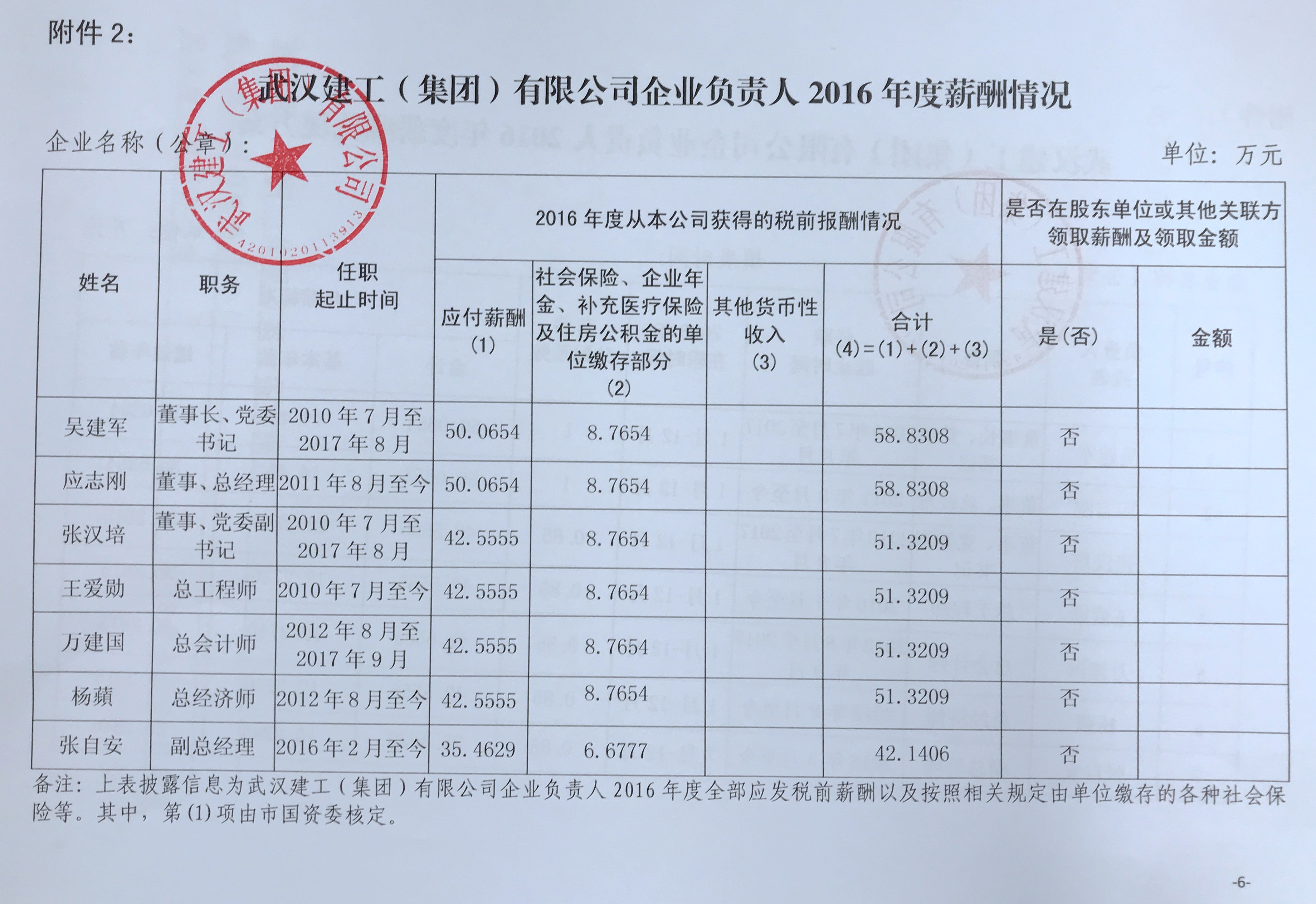 武漢建工(集團(tuán))有限公司企業(yè)負(fù)責(zé)人2016年度薪酬情況